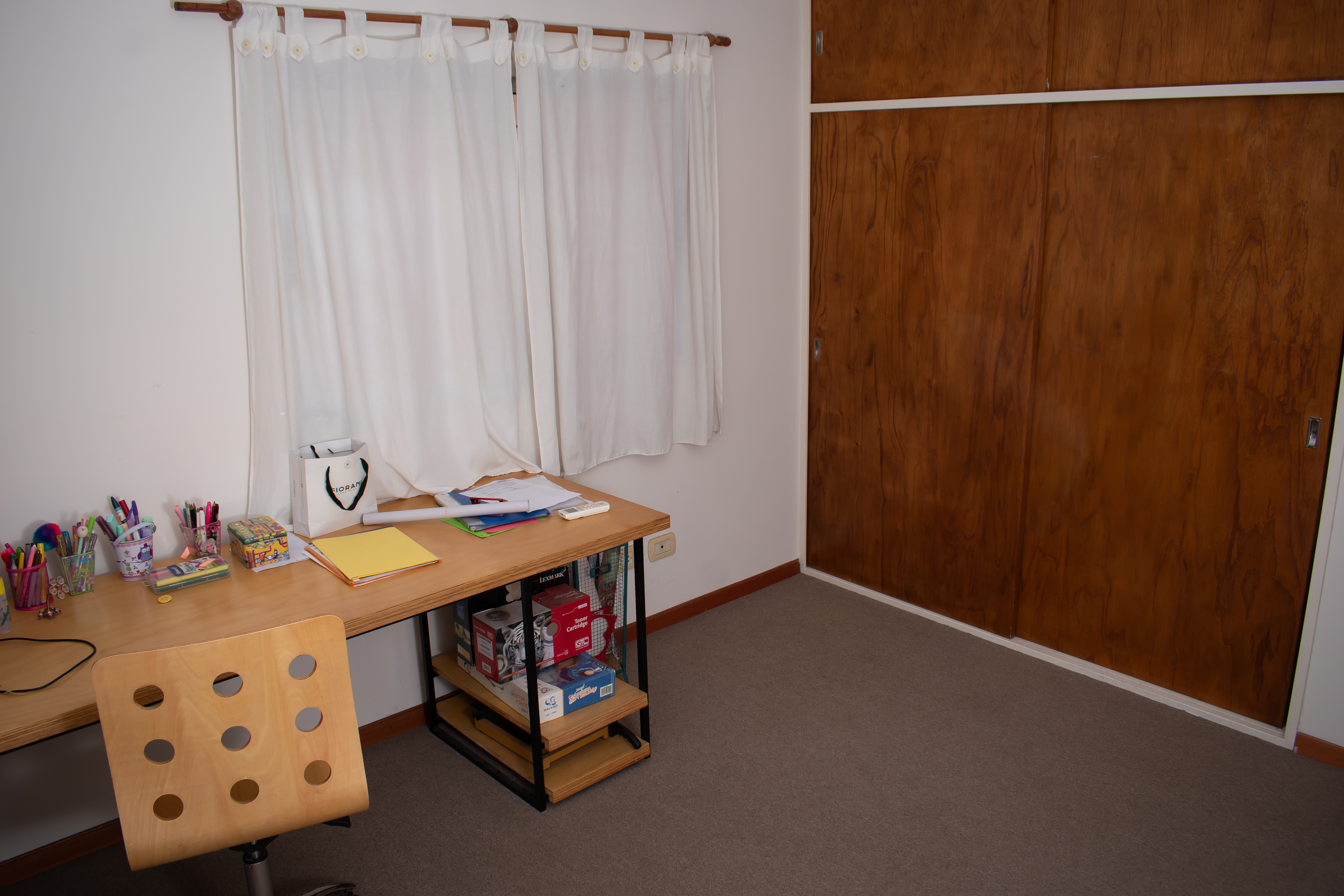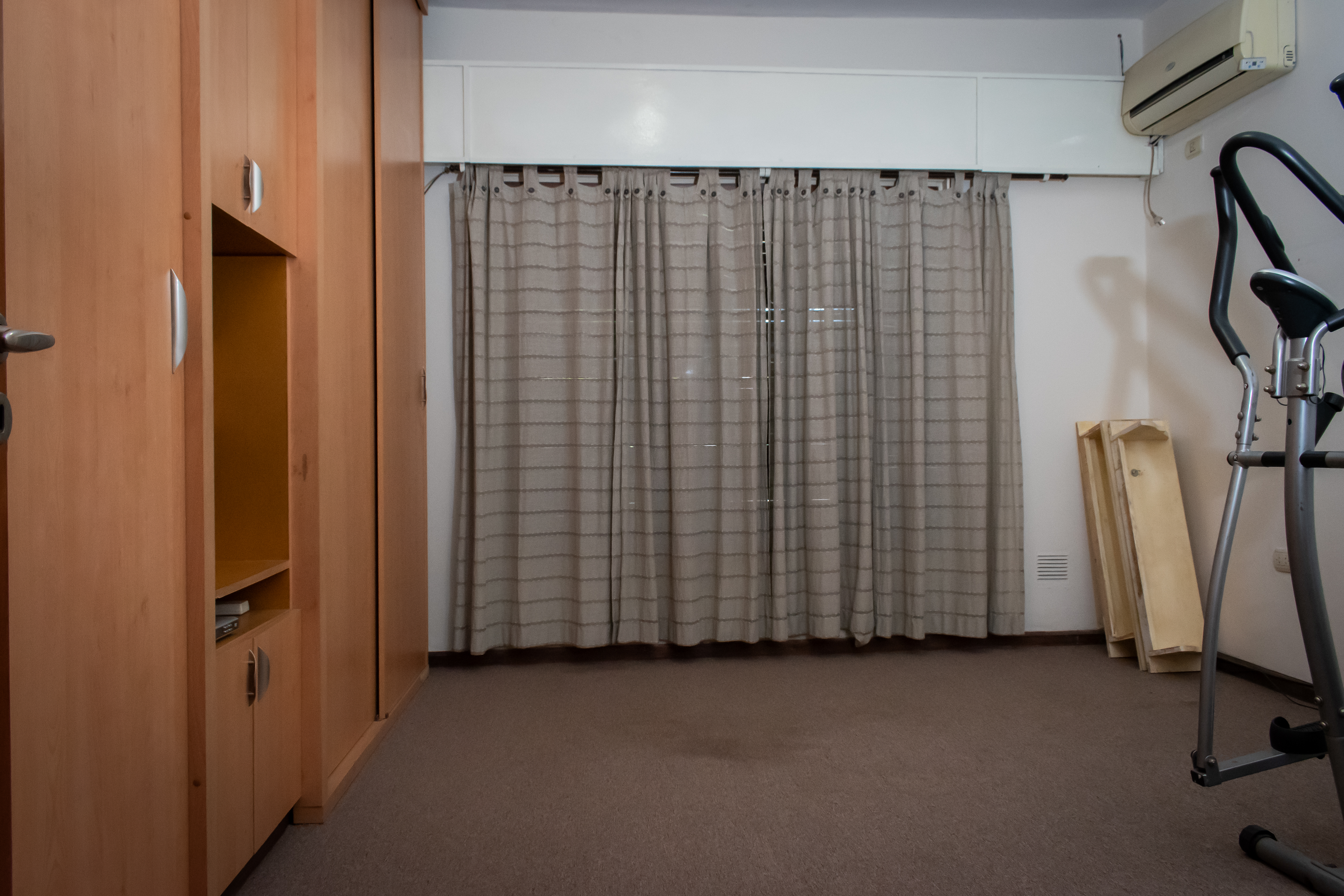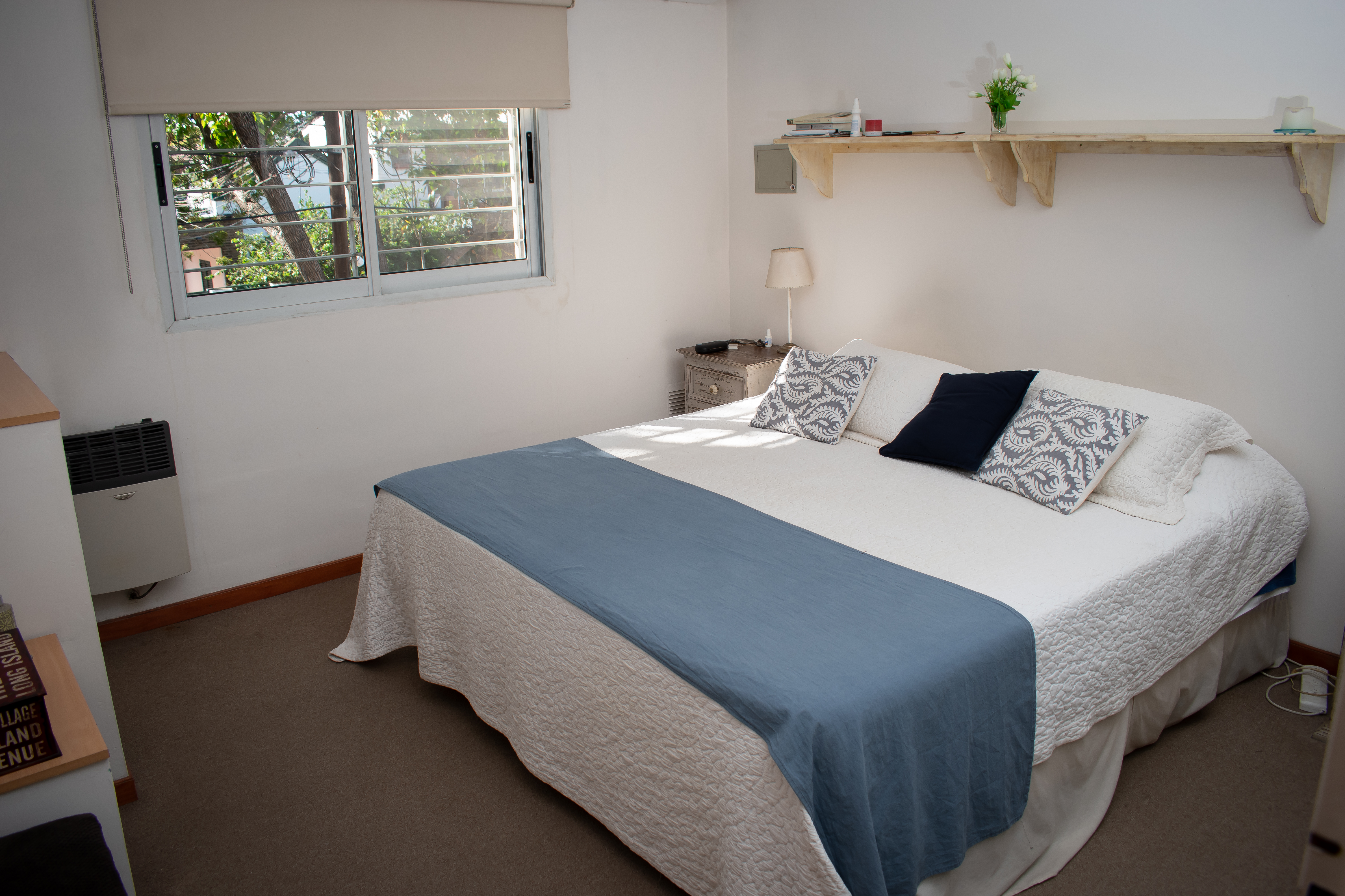 Habitación que da hacia el frente con alfombra y placard de pared a pared. Pequeña habitación de guardado. Baño completo con ducha.