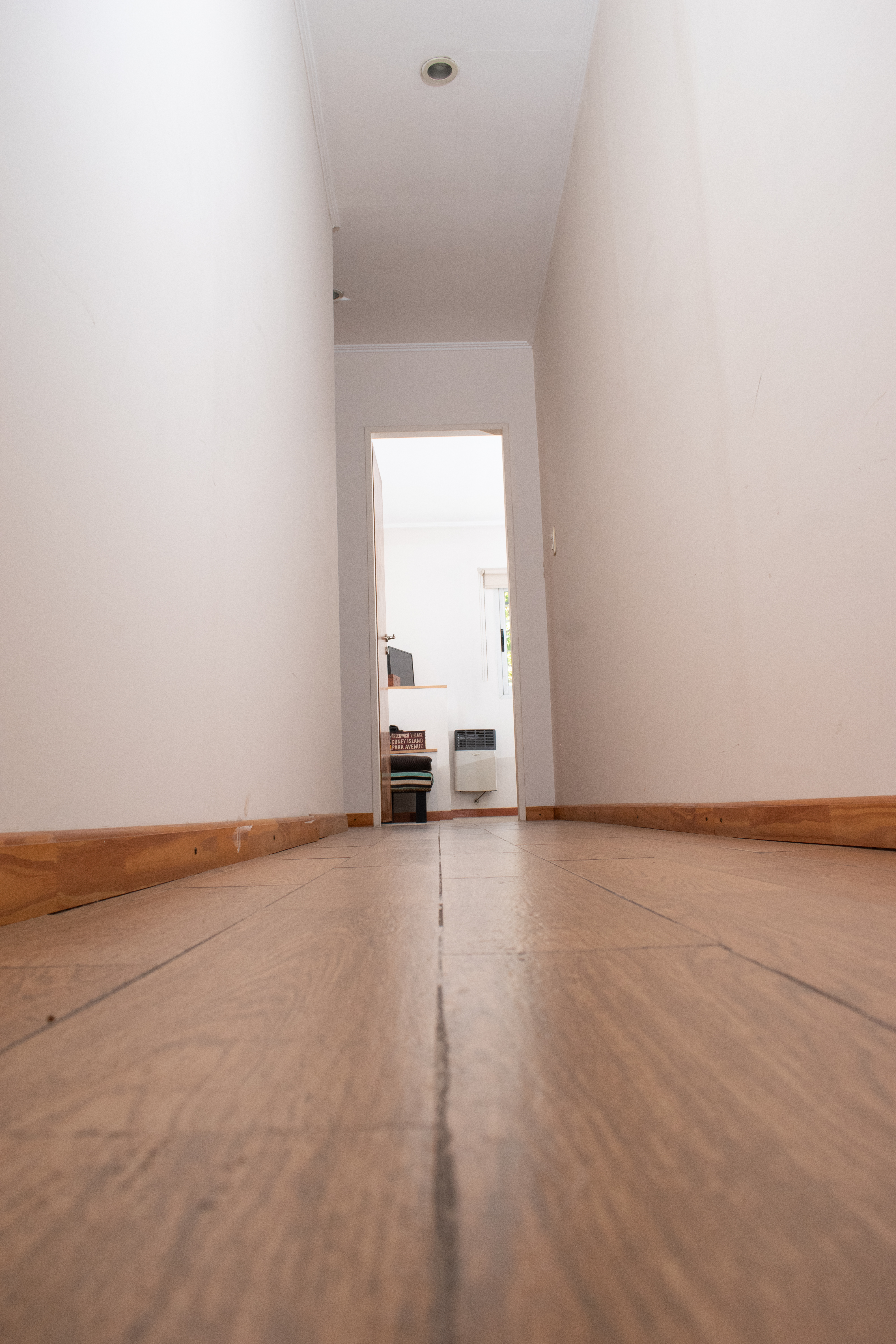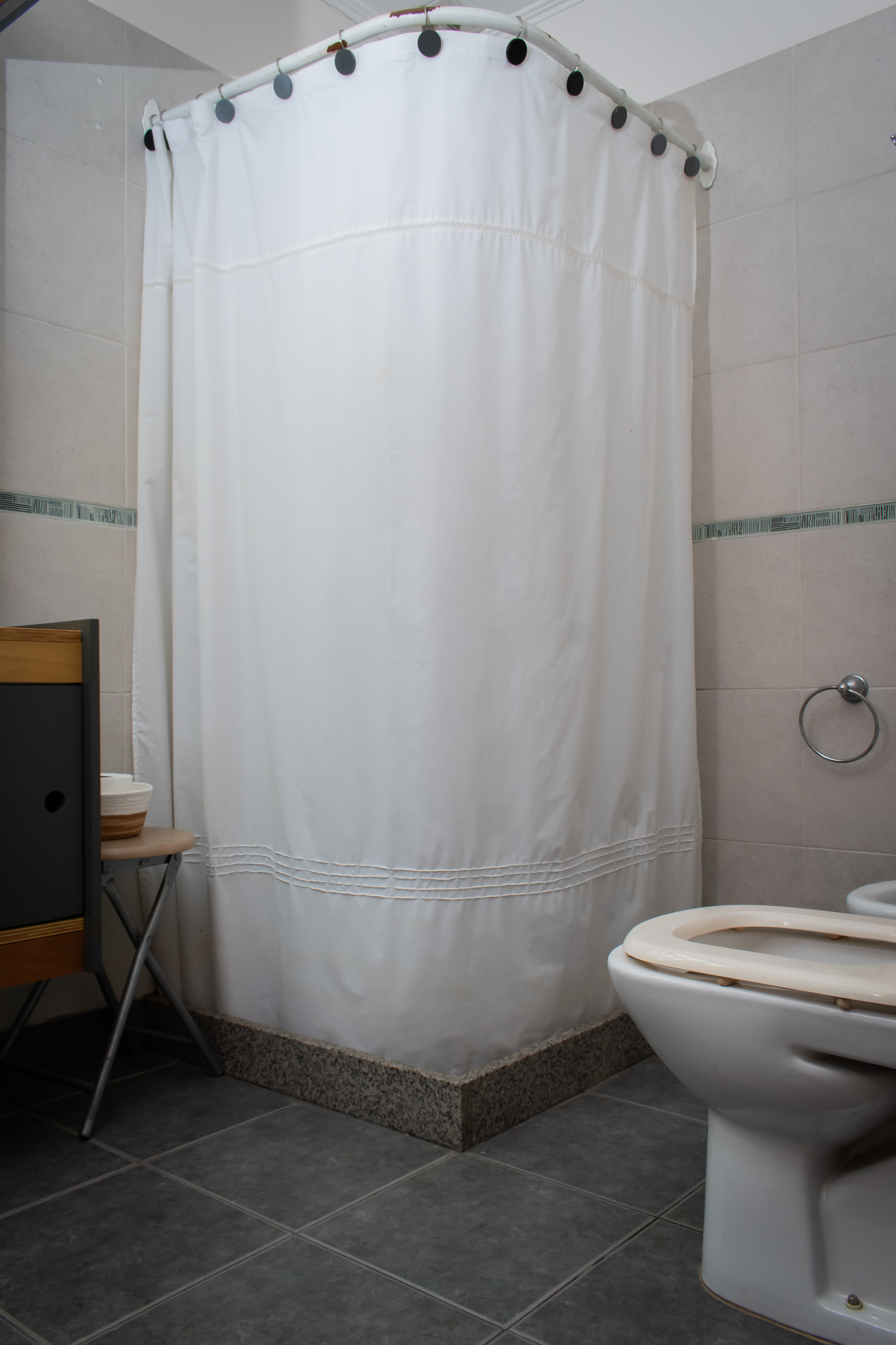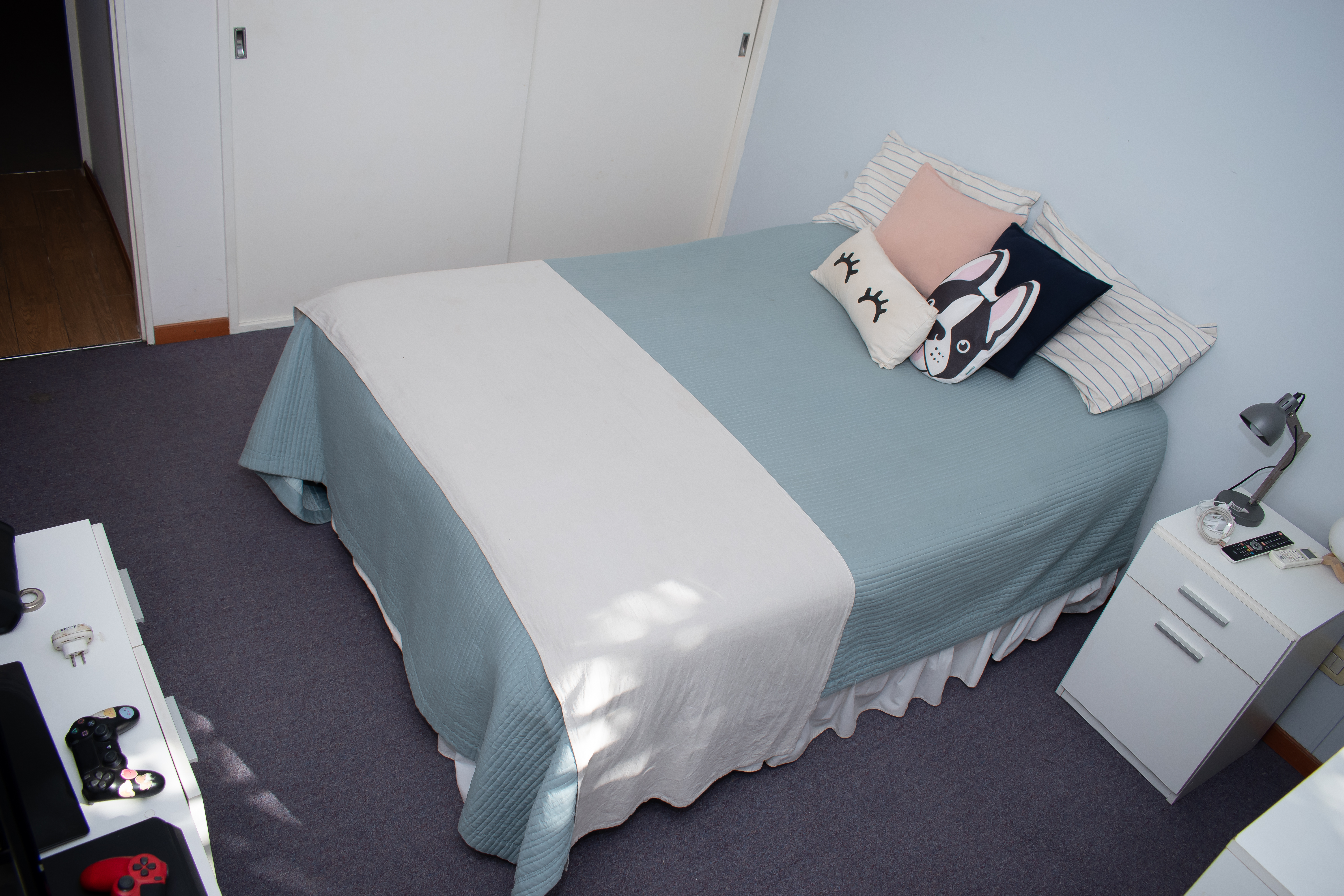 Habitación que da hacia el frente con alfombra y placard de pared a pared. Pequeña habitación de guardado. Baño completo con ducha.