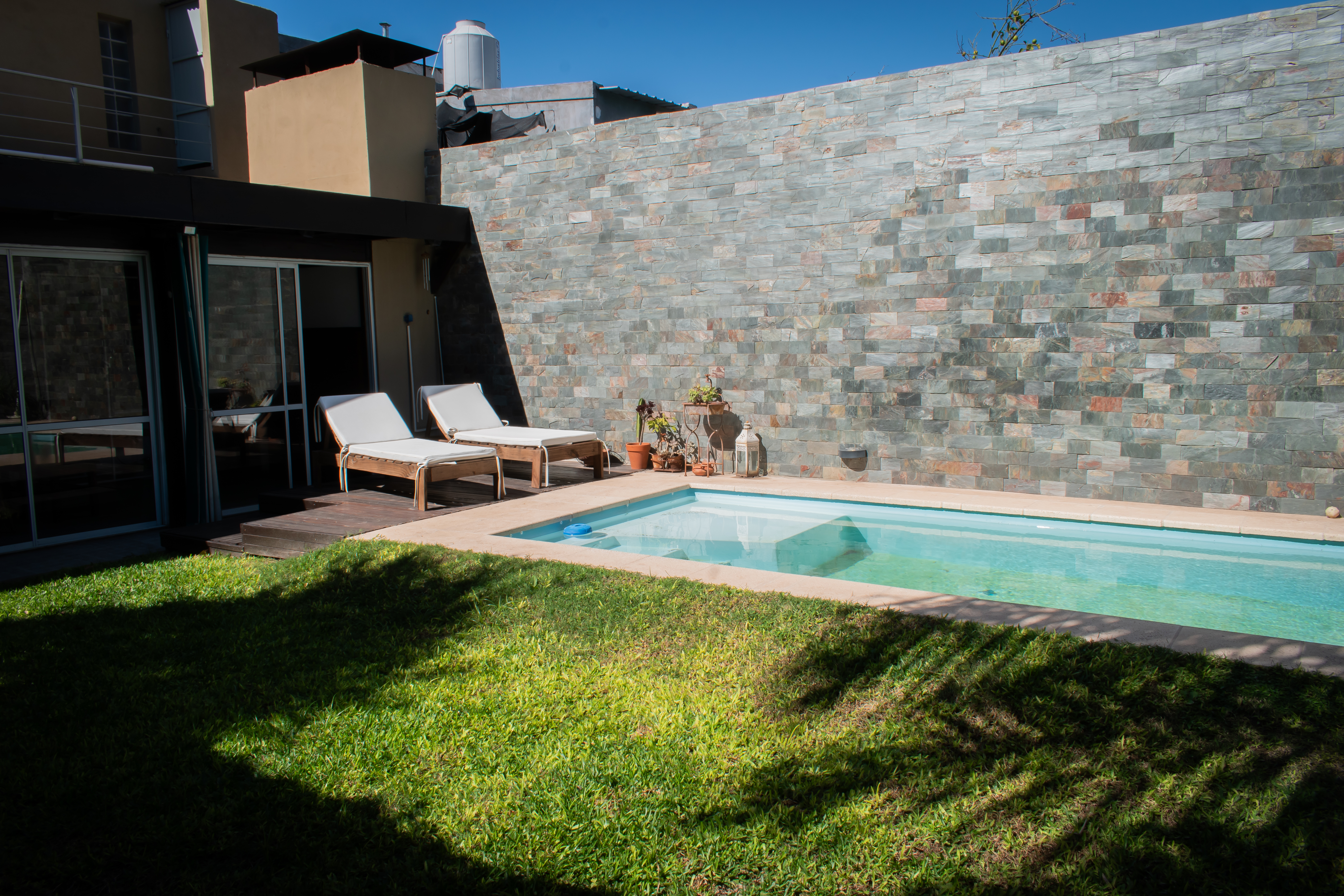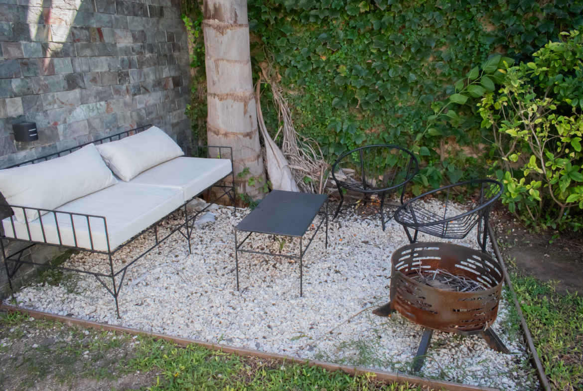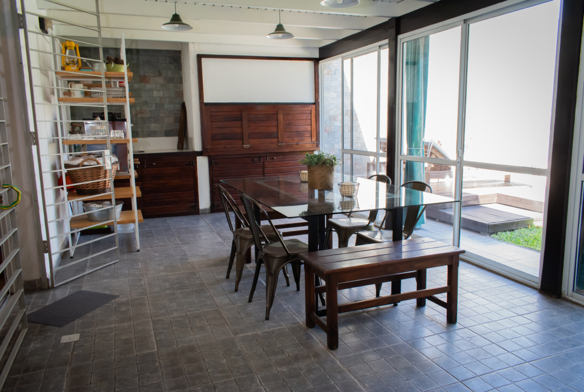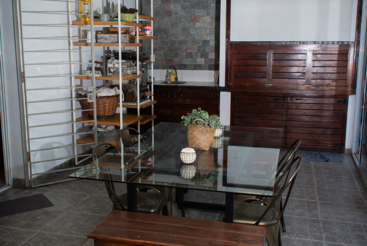 Dando paso al Jardín, tenemos un quincho cerrado con ventanales, donde se encuentra una parrilla con un cerramientos revestidos en madera, espacios de guardado y bacha. Desde ahí accedemos al solárium, con espacio verde. Sector con fogonero y piscina.