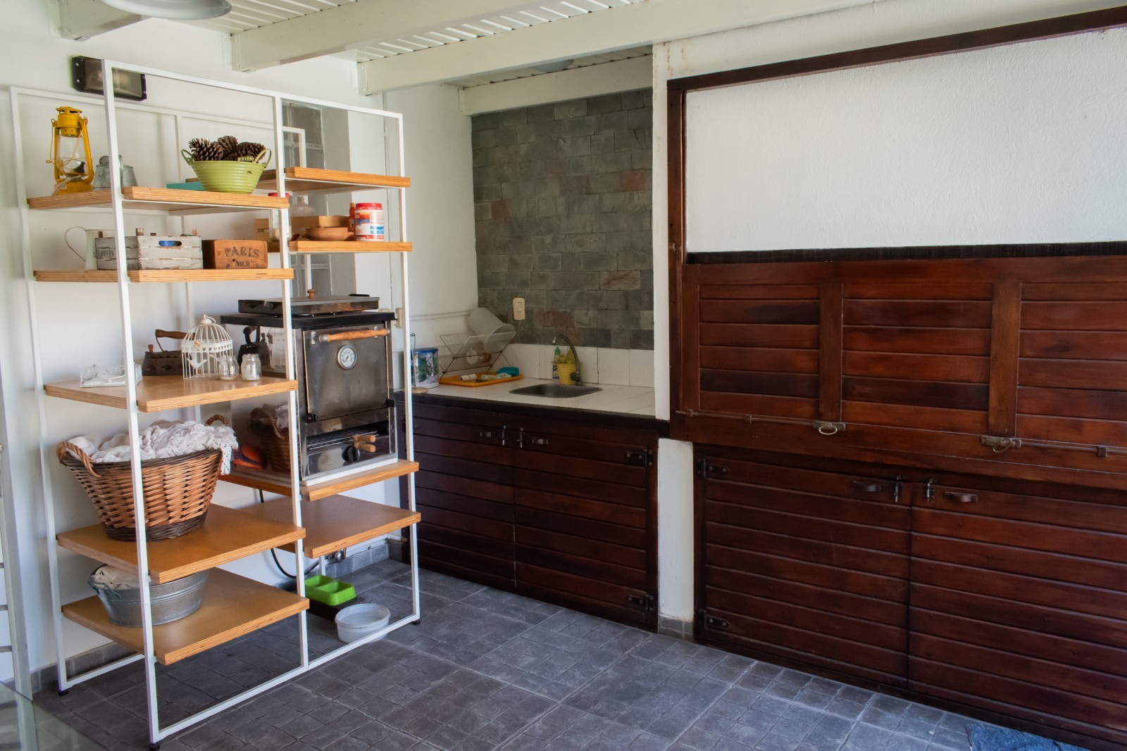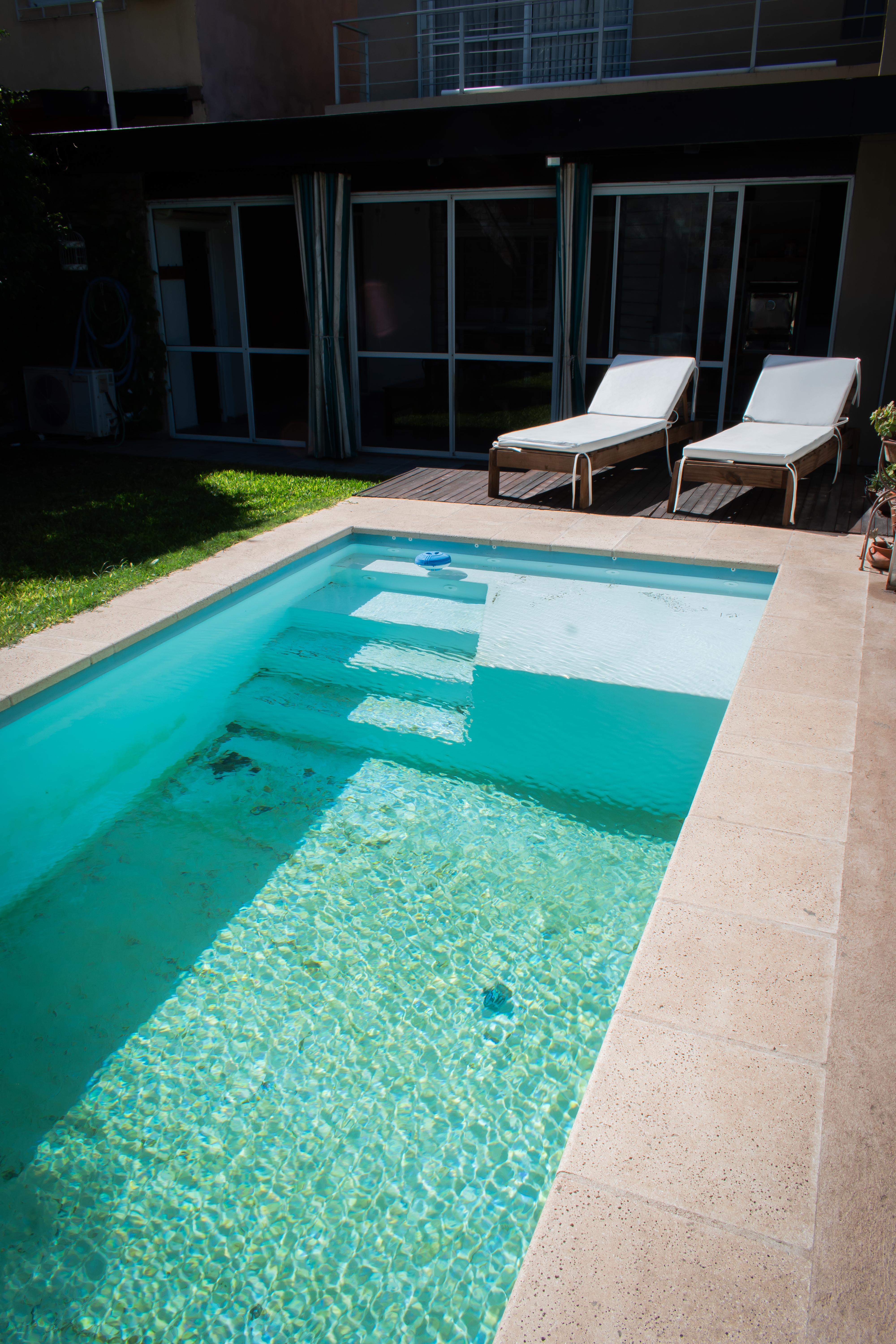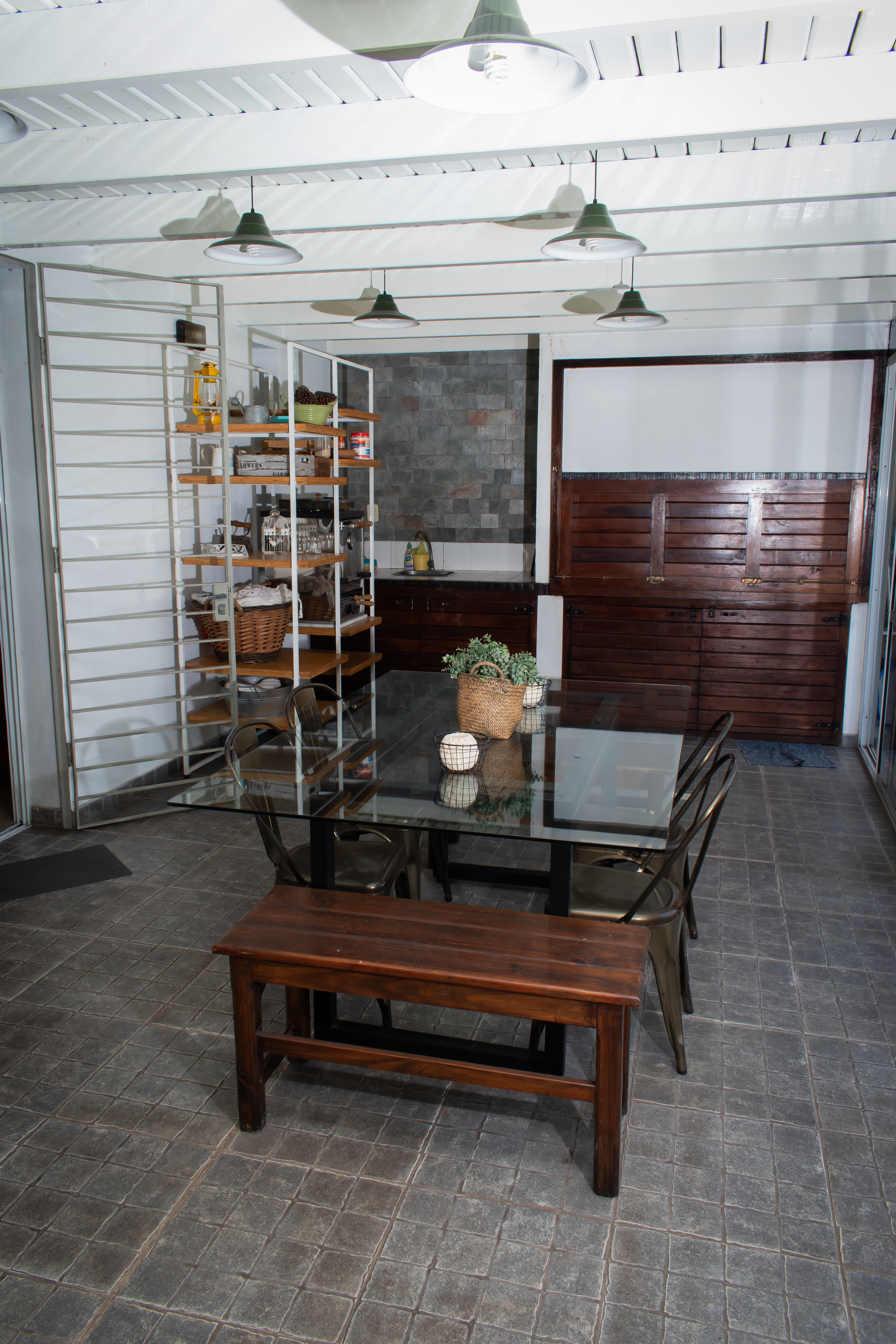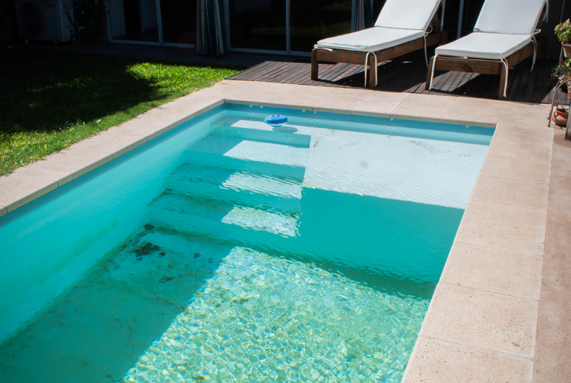 Dando paso al Jardín, tenemos un quincho cerrado con ventanales, donde se encuentra una parrilla con un cerramientos revestidos en madera, espacios de guardado y bacha. Desde ahí accedemos al solárium, con espacio verde. Sector con fogonero y piscina.