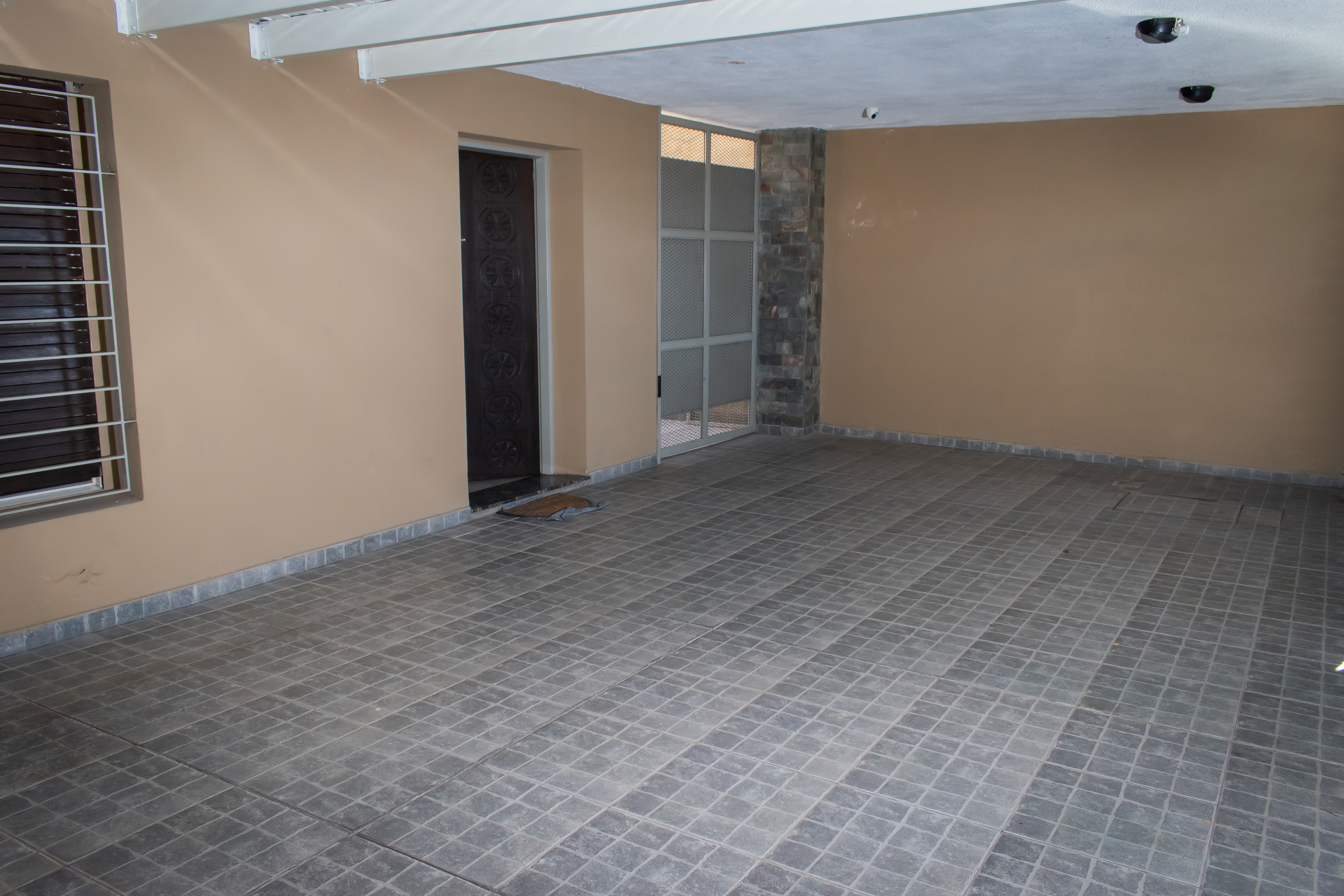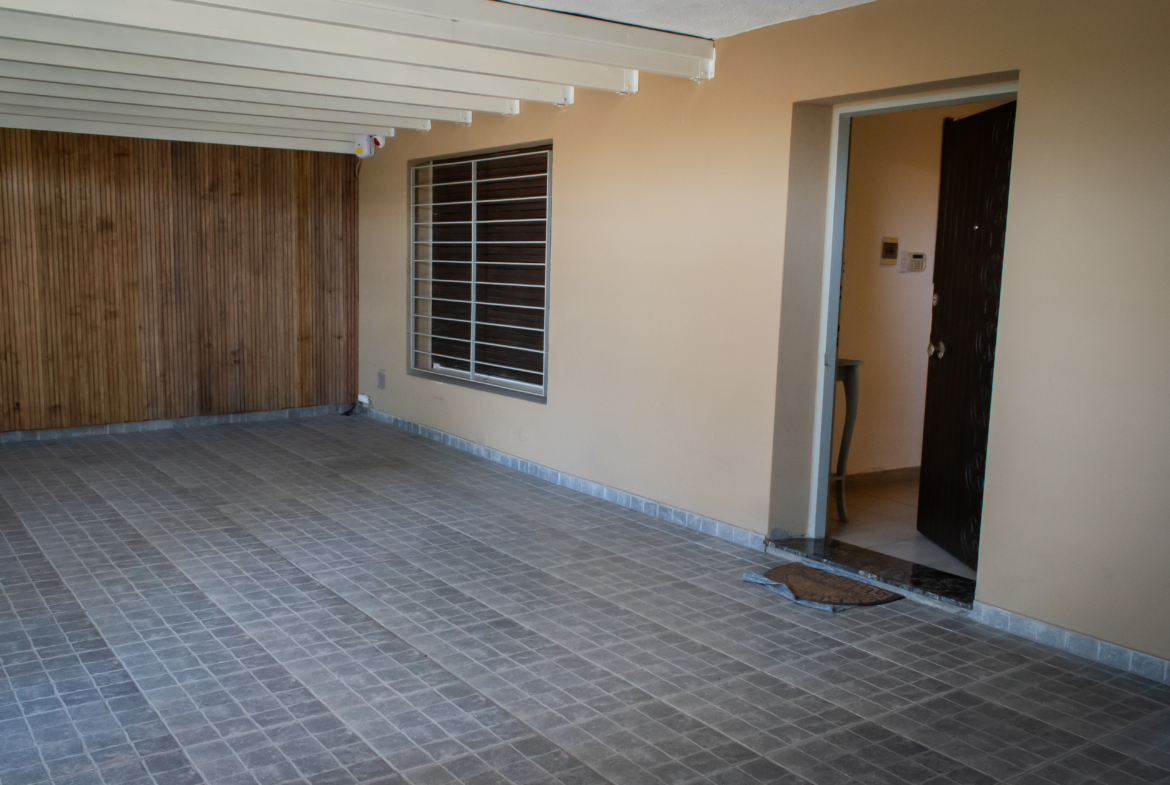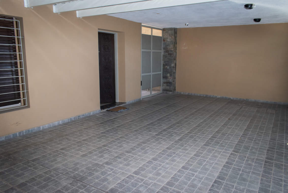 Se ingresa por una amplia cochera con espacio para dos autos. Desde la cochera tiene un portón lateral con reja para acceso hacia el fondo de la propiedad.