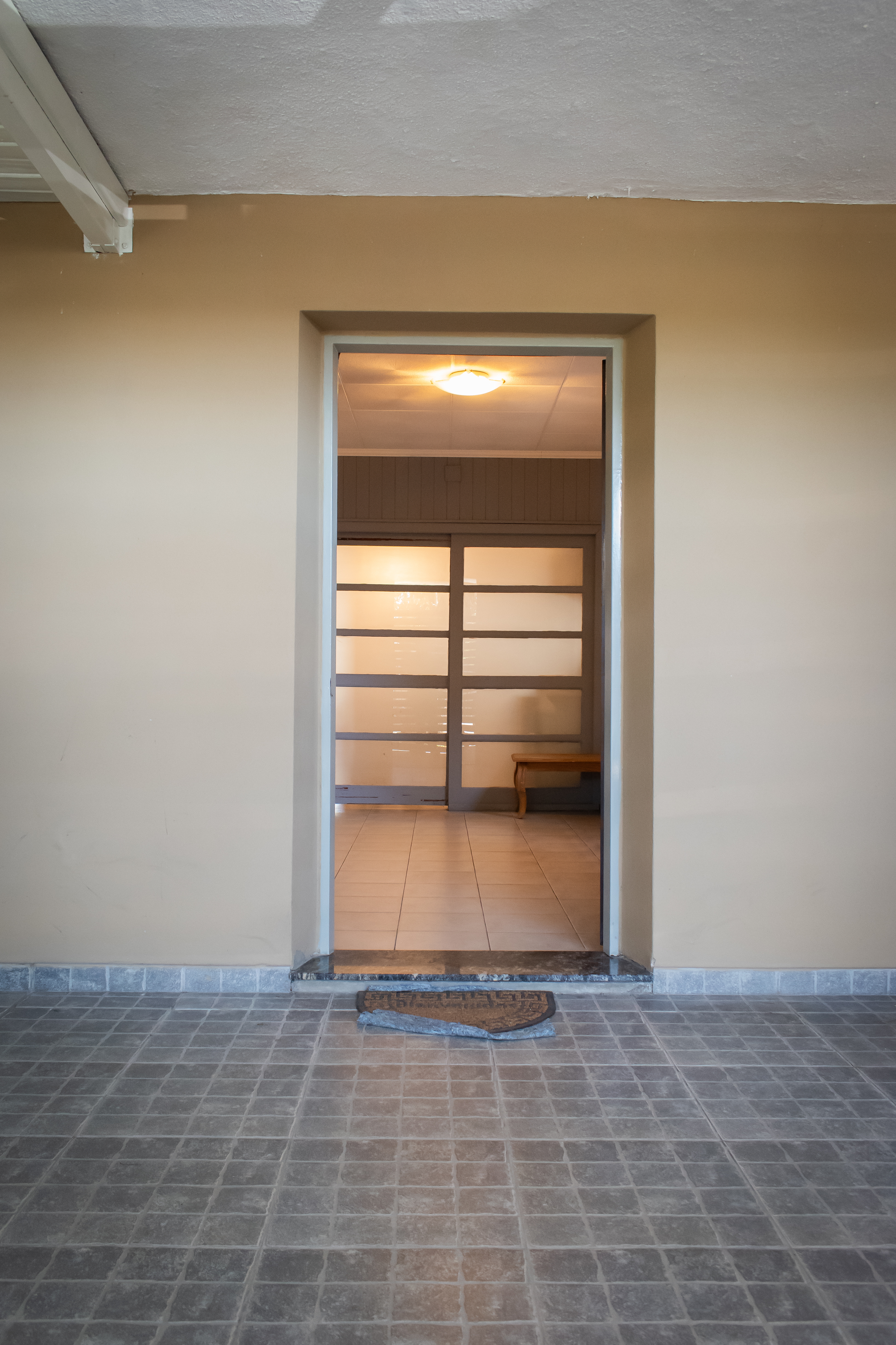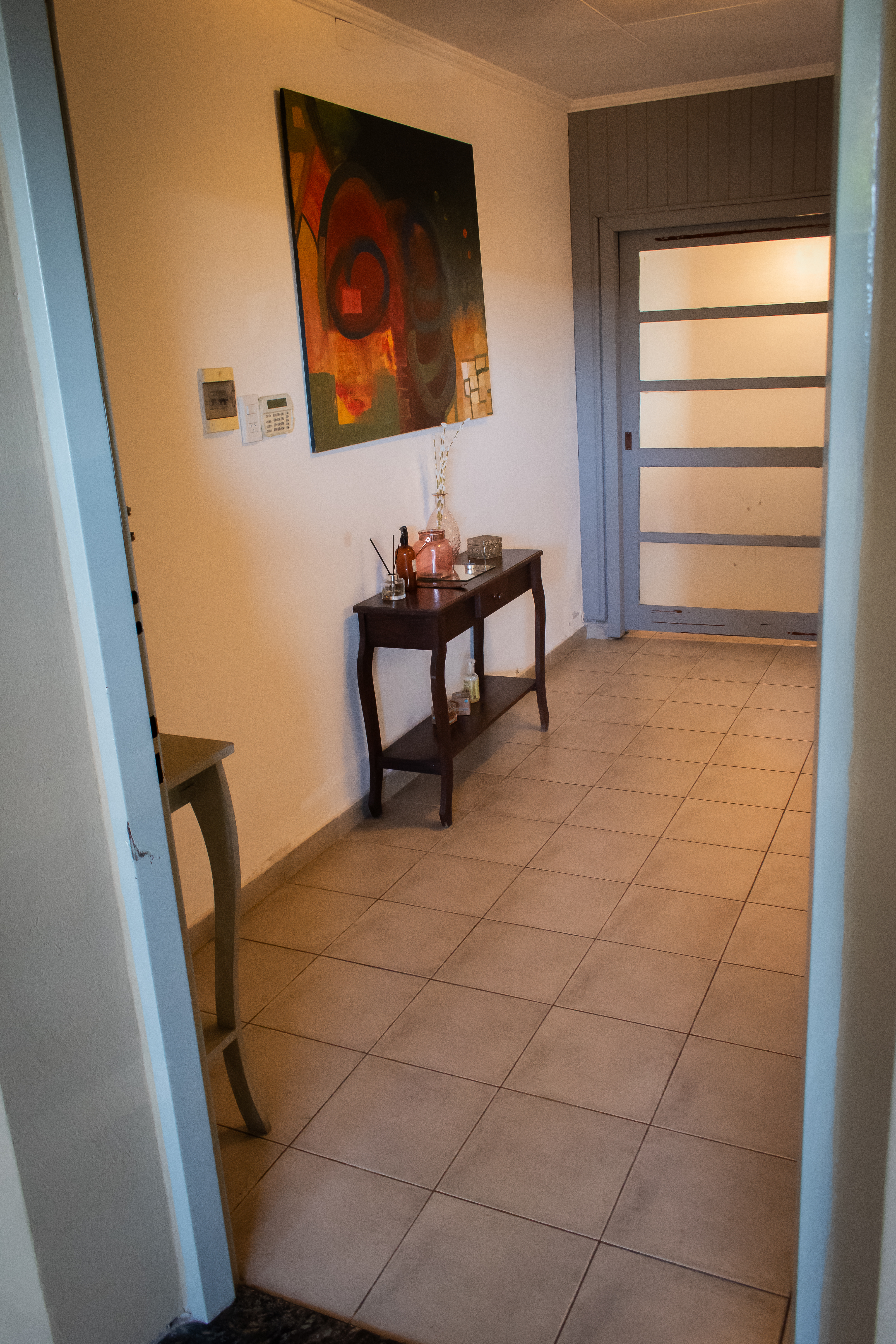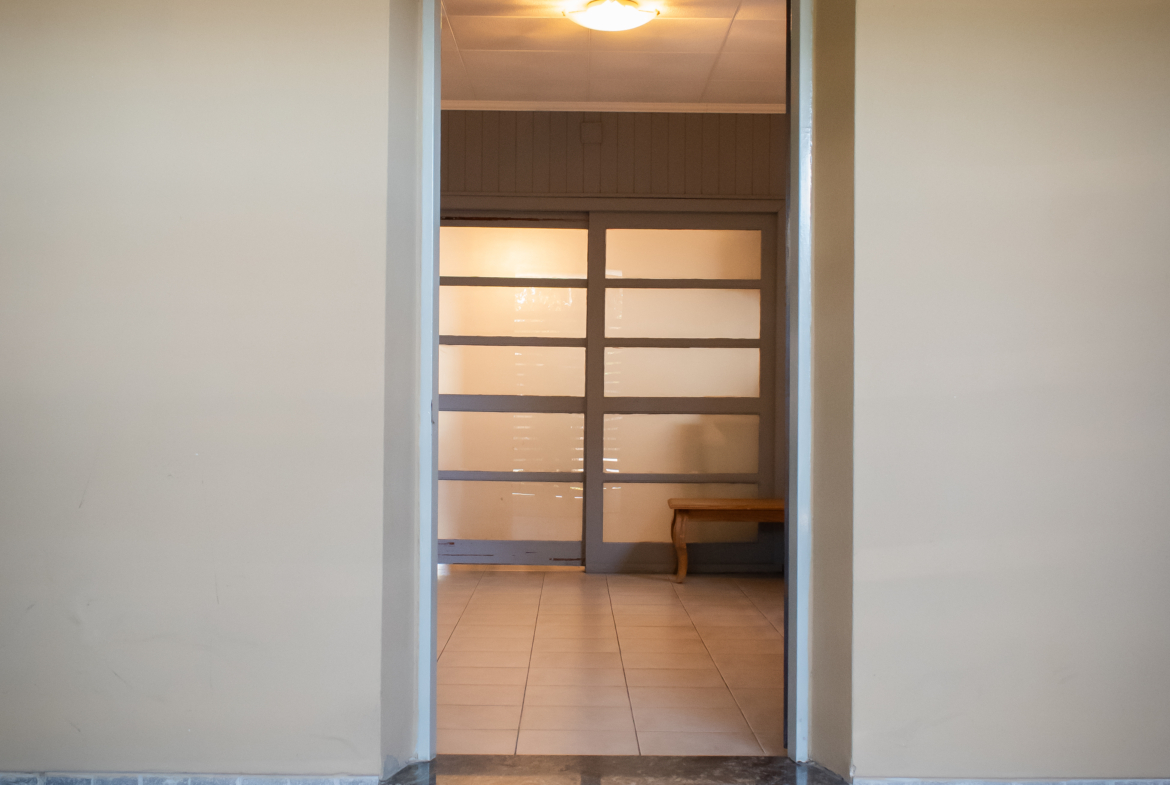 Se ingresa por una amplia cochera con espacio para dos autos. Desde la cochera tiene un portón lateral con reja para acceso hacia el fondo de la propiedad.